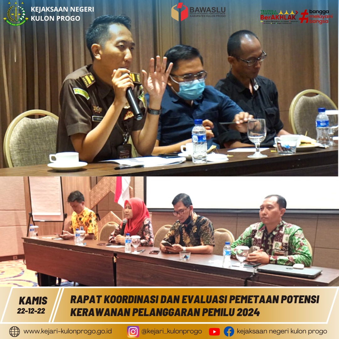 menjelang pemilu serentak 2024, banyak persiapan-persiapan yang terus dilakukan oleh berbagai pihak salah satunya yakni Bawaslu Kulon Progo yang melakukan Rakor Evaluasi Pemetaan Potensi Kerawanan Pelanggaran Pemilu 2024 pada tanggal 22 Desember 2022 bertempat di Hotel Grand Dafam Signature Kulon Progo, dalam kegiatan tersebut hadir mewakili Kejaksaan Negeri Kulon Progo Bp.Deka Fajar Pranowo, SH. selaku Kasubsi A Intelijen Kejari Kulon Progo.