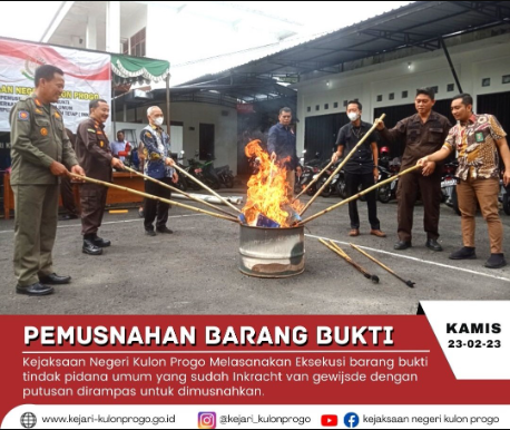 Pada hari Kamis tanggal 23 Februari 2023 pukul 09.00 - 10.05 WIB di Halaman Kantor Kejaksaan Negeri Kulonprogo telah dilaksanakan kegiatan Pemusnahan Barang Bukti Perkara Tindak Pidana Umum Yang Telah Mempunyai Kekuatan Hukum Tetap DENGAN dengan putusan dirampas untuk dimusnahkan, kegitan tersebut dihadiri oleh Kepala Kejaksaan Negeri Kulonprogo Ardhi Suryanto, SH. MH., Kepala Rupbasan Kelas II Wates yang diwakili oleh Kasubsi Barang Rampasan Suhono, SH., Kapolres Kulonprogo yang diwakili oleh Kabag Ops Kompol Budi Kustanto, SH., Ketua Pengadilan Negeri Wates yang diwakili oleh Panitera Muda Pidana Andang Catur Prasetyo, SH.,MH., Kepala Satuan Pol PP Kabupaten Kulonprogo yang diwakili oleh Sekretaris Dinas Suwarno, SIP., MM, Kepala Seksi Tindak Pidana Umum Kejaksaan Negeri Kulon Progo Martin Eko P, SH. MH., Kepala Seksi Barang Bukti dan Barang Rampasan Kejaksaan Negeri Kulon Progo Baransyah Hendri O., SH., Jajaran pejabat Kasubsi, Jaksa Fungsional dan Pegawai Kejaksaan Negeri Kulon Progo yang berjumlah 15 orang.
