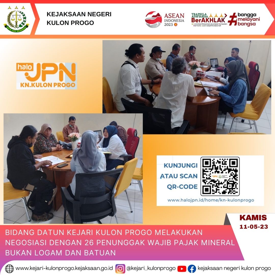 Wates, Kamis tanggal 11 Mei 2023, Jaksa Pengacara Negara pada Kejaksaan Negeri Kulon Progo melakukan Bantuan Hukum Non Litigasi berdasarkan Surat Kuasa Khusus (SKK) dari Badan Keuangan dan Aset Daerah (BKAD) Kabupaten Kulon Progo terkait Tunggakan Wajib Pajak Mineral Bukan Logam dan Batuan (MBLB) sebanyak 26 (dua puluh enam) Penunggak Wajib Pajak yang diundang ke Kantor Pengacara Negara pada Kejaksaan Negeri Kulon Progo untuk Negosiasi atas kendala pembayaran maupun kesanggupan untuk melunasi tunggakan pembayaran pajak tersebut.