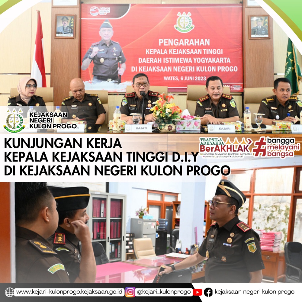 Dalam kesempatan tersebut Kajati DIY meninjau ruangan untuk melihat sarana dan prasarana kantor disamping juga melihat ketertiban administrasi, pelayanan maupun kebersihan lingkungan kantor. Selanjutnya dilakukan briefing dan pengarahan oleh Kajati DIY kepada jajaran di Kejaksaan Negeri Kulon Progo.