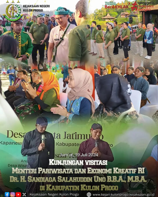 Pada hari jumat tanggal 19 Juli 2024 Kepala Kejaksaan Negeri Kulon Progo yang di wakili oleh Kasubsi B intelijen Kejari Kulon Progo Ibu Mita Mei Setya Rumekti, S.H. turut serta dalam kegiatan penyambutan kunjungan kerja menteri pariwisata dan ekonomi kreatif RI Dr H. Sandiaga Salahuddin Uno, B.B.A,M.B.A , beserta jajaran menparekraf di rest area Kembang Tebu, Pedukuhan Gendu, Kalurahan Jatimulyo, Kapanewon Girimulyo dalam rangka meresmikan desa wisata Jatimulyo ke dalam 50 besar Anugerah Desa Wisata Indonesia (ADWI ) 2024.