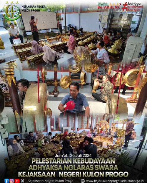 Halo sobat Adhyaksa.. Dalam rangka menumbuhkan tekad pelestarian terhadap budaya Nasional, Kepala Kejaksaan Negeri Kulonprogo Dr. Anton Rudiyanto, SH. MH melalui Jajaran Pejabat Struktural dan pegawai mengadakan kegiatan rutin latihan penabuh gamelan jawa di area Kantor Kejaksaan Negeri Kulonprogo.