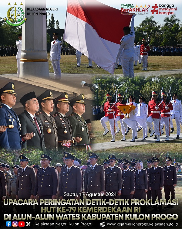 Pada hari Sabtu 17 Agustus 2024 Kepala Kejaksaan Negeri Kulon Progo Dr. Anton Rudiyanto, S.H., M.H., mengikuti Upacara Detik Detik Proklamsi HUT Ke-79 Kemerdekaan Republik Indonesia, yang diselenggarakan oleh Pemerintah Kabupaten Kulon Progo di Alun-Alun Wates.