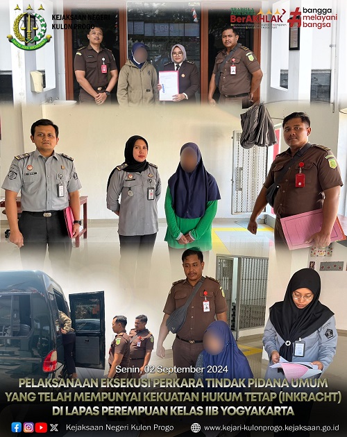 Dalam rangka pelaksanaan Putusan Pengadilan, Jaksa Penuntut Umum Kejaksaan Negeri Kulon Progo melakukan Eksekusi Badan terhadap Terpidana di di Lapas Perempuan (LPP) Kelas II B Yogyakarta, Senin (02/09/2024)