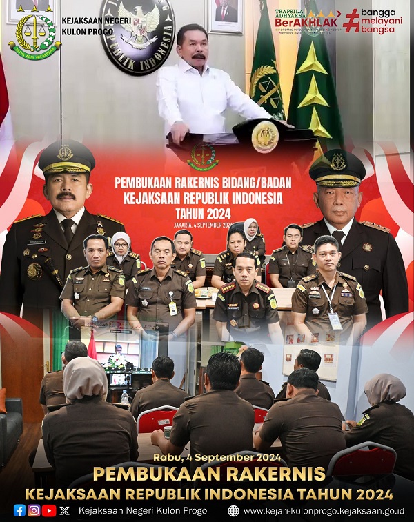 Kepala Kejaksaan Negeri Kulon Progo Bapak Dr. Anton Rudiyanto, SH., MH. beserta seluruh jajaran mengikuti Rapat Kerja Teknis (Rakernis) yang diselenggarakan oleh Kejaksaan Agung Republik Indonesia secara daring dari Ruang Zoom Meeting Kantor Kejaksaan Negeri Kulon Progo dalam rangka memahami kebijakan dan keputusan Pimpinan yang akan digunakan sebagai pedoman pelaksanaan tugas pokok dan fungsinya masing masing bidang. Rabu (04/09/2024)