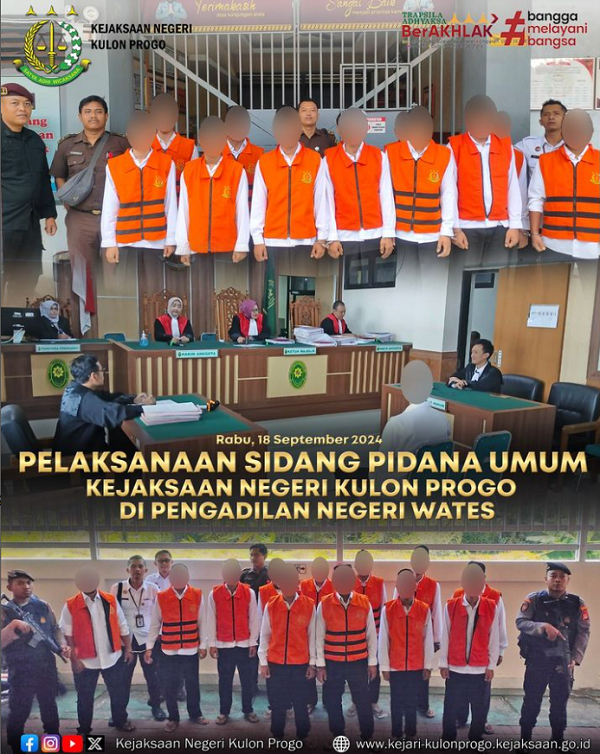 Dalam rangka melaksanakan fungsi penuntutan di Daerah Hukum Kejaksaan Negeri Kulon Progo, Jaksa Penuntut Umum telah melaksanakan persidangan Tindak Pidana Umum di Pengadilan Negeri Wates terhadap diri para terdakwa dengan agenda masing masing sesui dengan jadwal sidang yang telah ditetapkan pada persidangan sebelumnya. Rabu (18/09/2024)