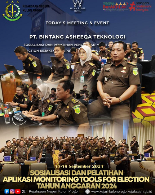 Kepala Seksi Intelijen Kejaksaan Negeri Kulonprogo beserta jajaran mengikuti acara Sosialisasi dan Pelatihan Aplikasi Monitoring Tools For Election Kejaksaan Republik Indonesia Tahun Anggaran 2024 yang diselenggarakan oleh Kejaksaan Agung Republik Indonesia di Kota Semarang, Provinsi Jawa Tengah, kegeiatan tersebut dalam rangka meningkatkan kualitas pelayanan publik dengan launching aplikasi terbaru untuk lingkup Kejaksaan di Indonesia. Kamis (19/202024)