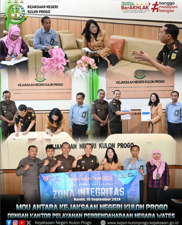 Pada hari Kamis, 19 September 2024 bertempat di Kantor Kejaksaan Negeri Kulon Progo telah dilaksanakan MoU antara Kejaksaan Negeri Kulon Progo dengan Kantor Pelayanan Perbendaharaan Negara Wates terkait dengan Kerjasama dalam Upaya Pencegahan Tindak Pidana Korupsi, Kamis (19/09/2024)