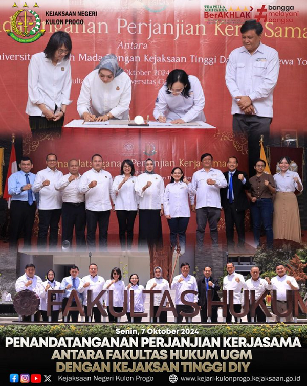 Pada Hari Senin tanggal 07 Oktober 2024, Kepala Kejaksaan Negeri Kulon Progo menghadiri Penandatanganan Perjanjian Kerjasama antara Fakultas Hukum UGM dengan Kejaksaan Tinggi Daerah Istimewa Yogyakarta di Auditorium Gedung B Fakultas Hukum UGM. Ruang lingkup kerja sama yang disepakati bersama antara Fakultas Hukum UGM dengan seluruh pihak mitra adalah terait peningkatan penyelenggaraan kerja sama di bidang pendidikan, penelitian, dan pengabdian kepada masyarakat. Kerja sama ini dibangun utamanya untuk melaksanakan Tri Dharma Perguruan Tinggi.