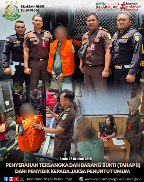 Halo sobat Adhyaksa! Dalam rangka melaksanakan salah satu fungsi penuntutan, Jaksa Penuntut Umum pada Kejaksaan Negeri Kulon Progo melaksanakan tahap II terhadap perkara yang sedang ditangani dan dilanjutkan pengiriman para tersangka ke Rutan Kelas II b Wates