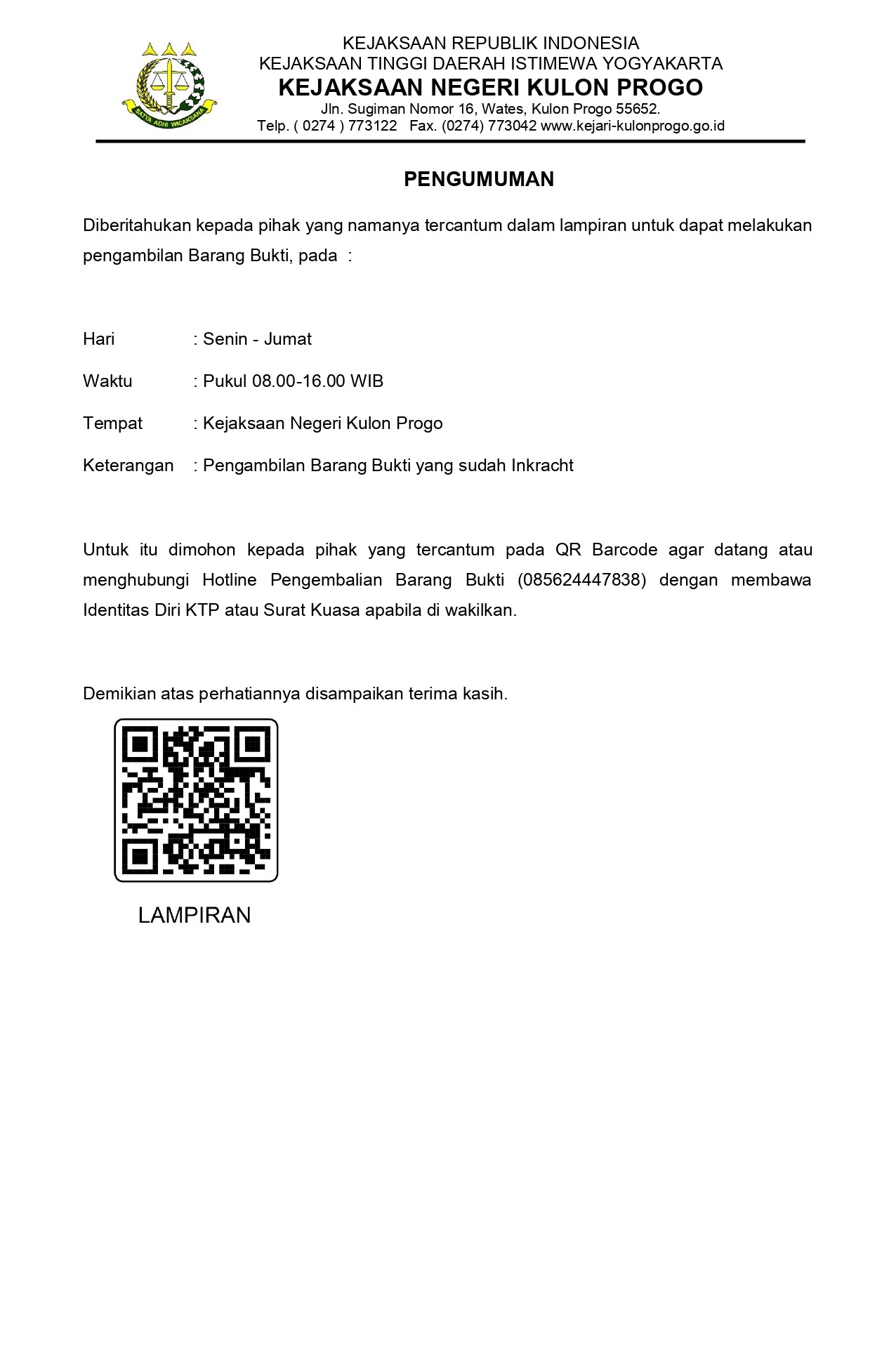 PENGUMUMAN DAFTAR BARANG BUKTI YANG SUDAH INKRACHT