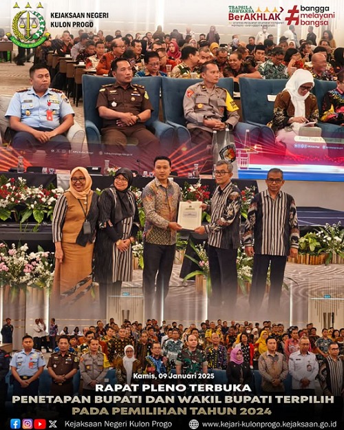 Pada Hari Kamis, 09 Januari 2025 Kepala Kejaksaan Negeri Kulon Progo yang diwakili oleh Kepala Seksi Intelijen menghadiri Rapat Pleno Terbuka Penetapan Bupati dan Wakil Bupati Terpilih pada Pemilihan Tahun 2024, bertempat di Hotel Novotel YIA.
