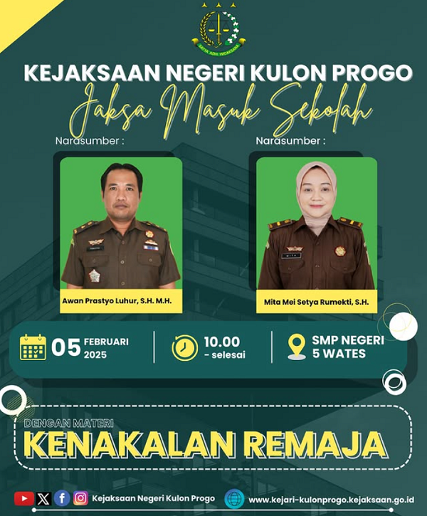 Program Jaksa Masuk Sekolah Kejaksaan Negeri Kulon Progo hadir di SMP Negeri 5 Wates, dengan Narasumber Bapak Kasi Intel Kejaksaan Negeri Kulon Progo dan Ibu Kasubsi B Kejaksaan Negeri Kulon Progo, dengan mengangkat Tema Kenakalan Remaja, Kejaksaan Negeri Kulon Progo Membangun generasi yang sadar hukum.
