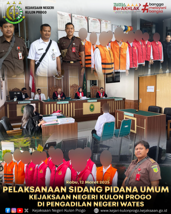 Dalam rangka melaksanakan fungsi penuntutan di Daerah Hukum Kejaksaan Negeri Kulon Progo, Jaksa Penuntut Umum telah melaksanakan persidangan Tindak Pidana Umum di Pengadilan Negeri Wates terhadap diri para terdakwa dengan agenda masing-masing sesuai dengan jadwal sidang yang telah ditetapkan pada persidangan sebelumnya. Rabu(12/03/2025)