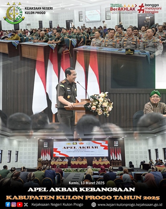 Pada hari Kamis tanggal 13 Maret 2025, Kepala Kejaksaan Negeri Kulon Progo Dr. Anton Rudiyanto, SH., MH. bersama unsur Forkopinda dan dinas terkait melaksanakan kegiatan Apel Akbar Kebangsaan Kabupaten Kulon Progo Tahun 2025 bertempat di Ruang Rapat Adikarto Komplek Pemkab Kulon Progobertempat di Ruang Rapat Adikarto Komplek Pemkab Kulon Progo.