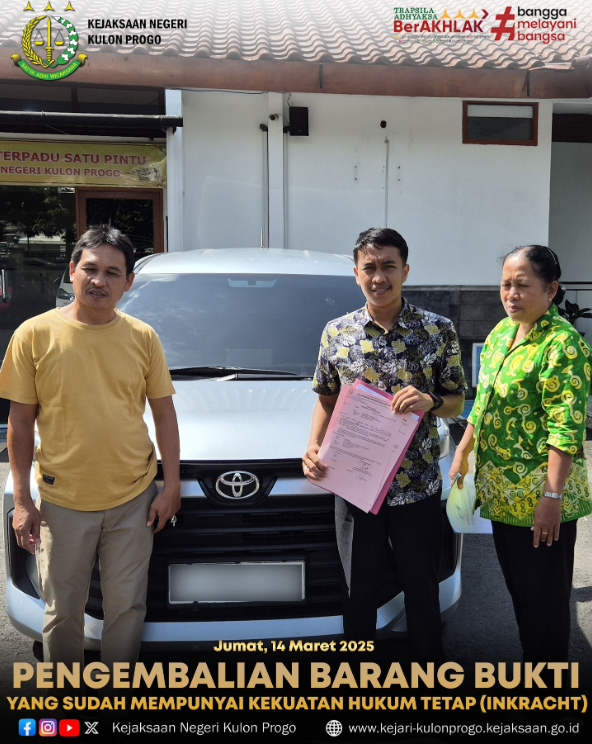 Bahwa barang bukti tersebut sudah tidak diperlukan lagi untuk kepentingan penuntutan, untuk pelaksanaan Putusan Pengadilan Negeri Wates Nomor 23/Pid. Sus/2025/PN Wat Tanggal telah mengembalikan barang bukti berupa 1. (satu) unit mobil Toyota Avanza warna Silver Metalik, tahun 2022 dengan Nopol B 1423 EZK, STNK atas nama Rani Sulistiyani Nomor rangka MHKAA1BYBNK011189, Nomor mesin 1NRG192625 beserta STNK dan kunci kontaknya kepada Purgiyanto. Jum'at (14/03/2025)