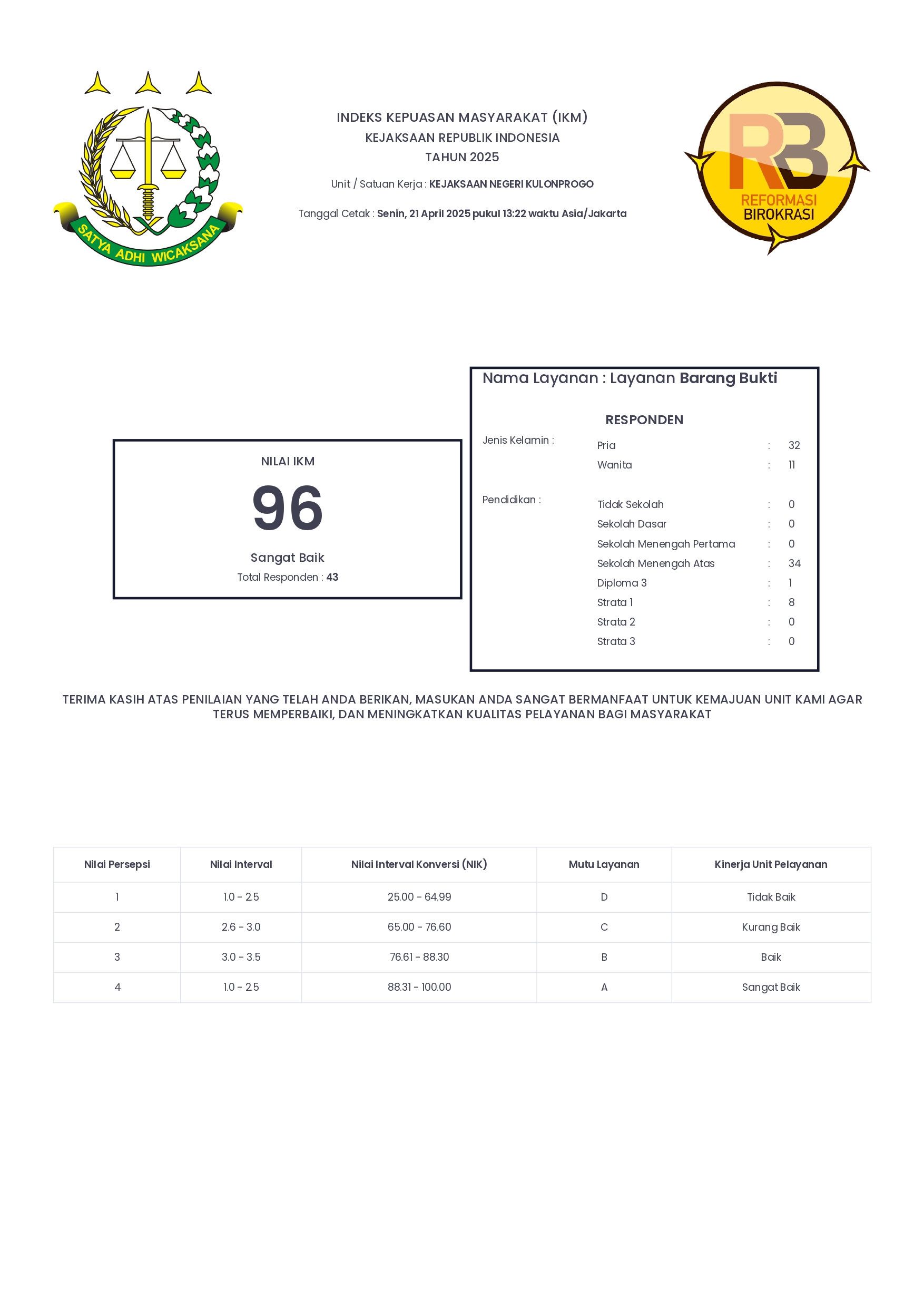 Indeks Kepuasan Masyarakat (IKM) Layanan Barang Bukti Kejaksaan Negeri Kulon Progo Tahun 2025