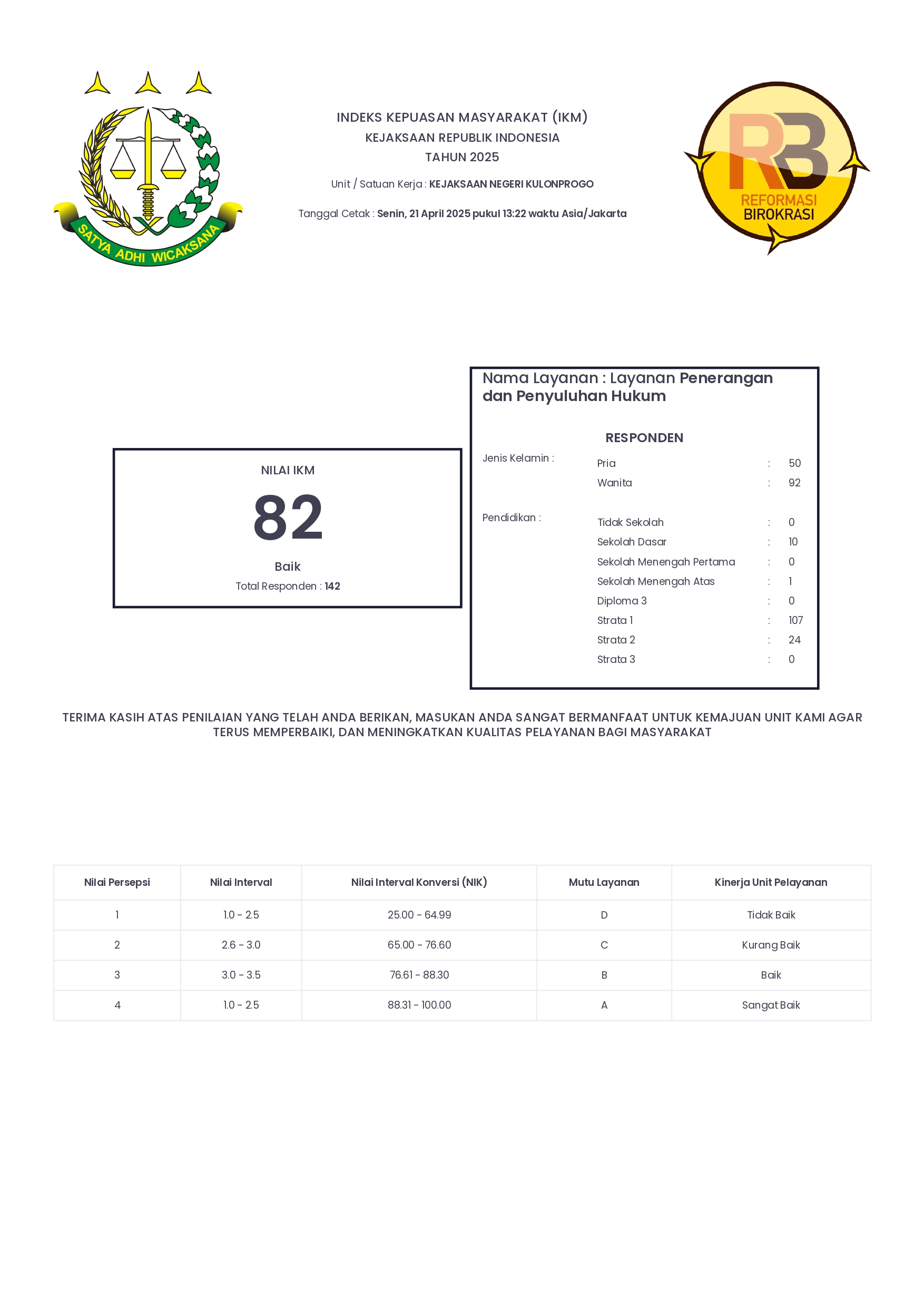 Indeks Kepuasan Masyarakat (IKM) Layanan Penerangan dan Penyuluhan Hukum Kejaksaan Negeri Kulon Progo Tahun 2025.