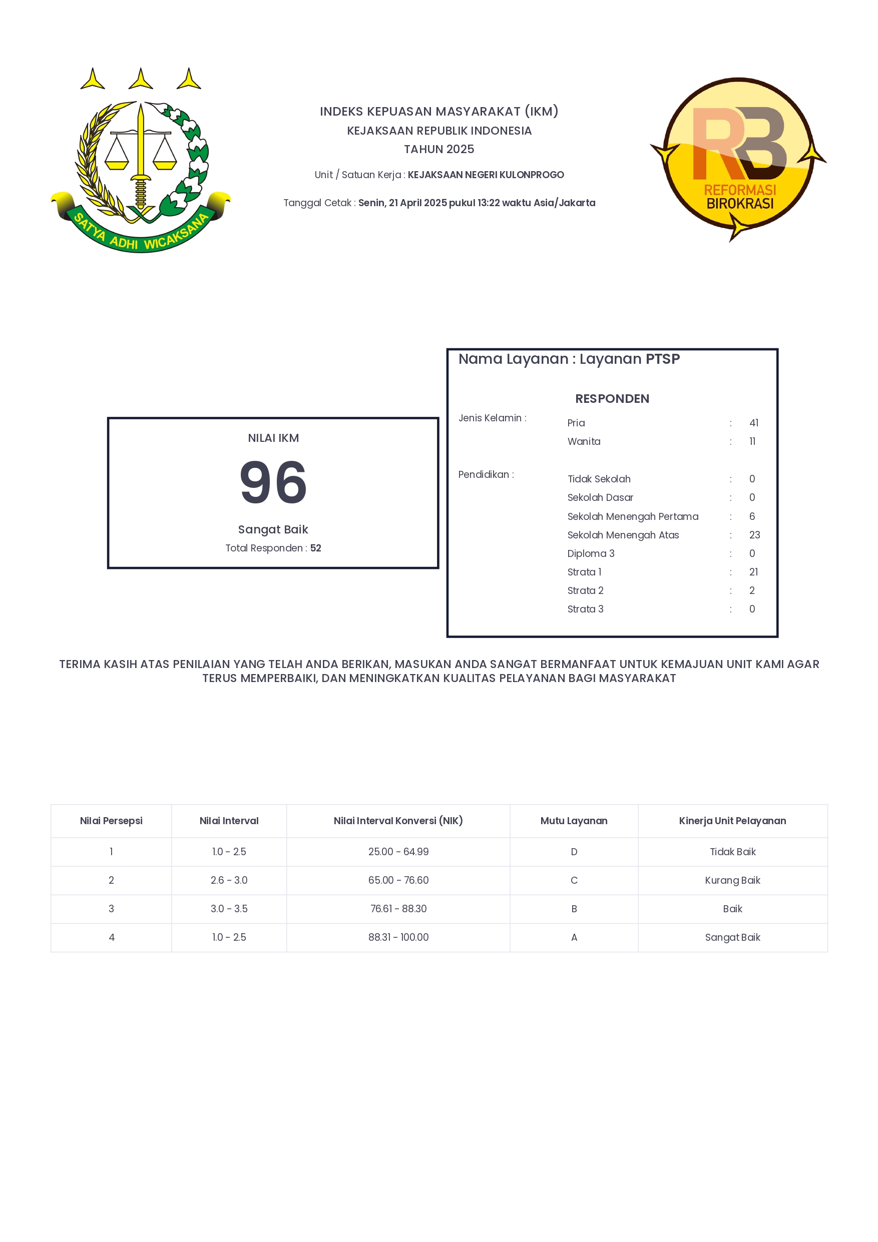 Indeks Kepuasan Masyarakat (IKM) Pelayanan Terpadu Satu Pintu (PTSP) Kejaksaan Negeri Kulon Progo Tahun 2025