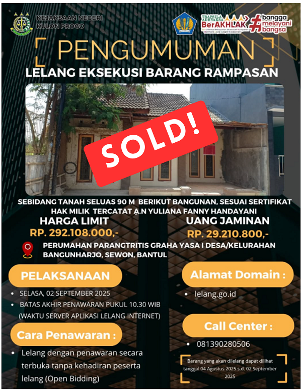 Kejaksaan Negeri Kulon Progo akan melaksanakan lelang Eksekusi Barang Rampasan sebidang tanah seluas 90m2 berikut bangunan diatasnya terletak di Perumahan Parangtritis Graha Yasa I Desa/Kelurahan Bangunharjo, Sewon, Bantul SHM tercatat atas nama YULIANA FANNY HANDAYANI dengan Nilai Limit sebesar Rp. 292.108.000,- dan uang jaminan sebesar Rp. 29.210.800,-.