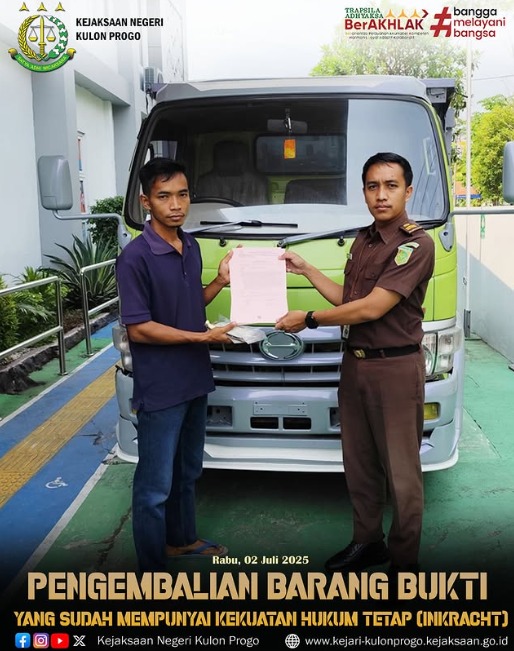 Rabu (02/07/2025), Dalam rangka pelaksanaan putusan Pengadilan khususnya terhadap barang bukti yang telah disita pada perkara tindak pidana umum, Jaksa Penuntut Umum Kejaksaan Negeri Kulon Progo melakukan pengembalian barang bukti yang telah mempunyai keuatan hukum tetap (inkcraht) kepada yang berhak.