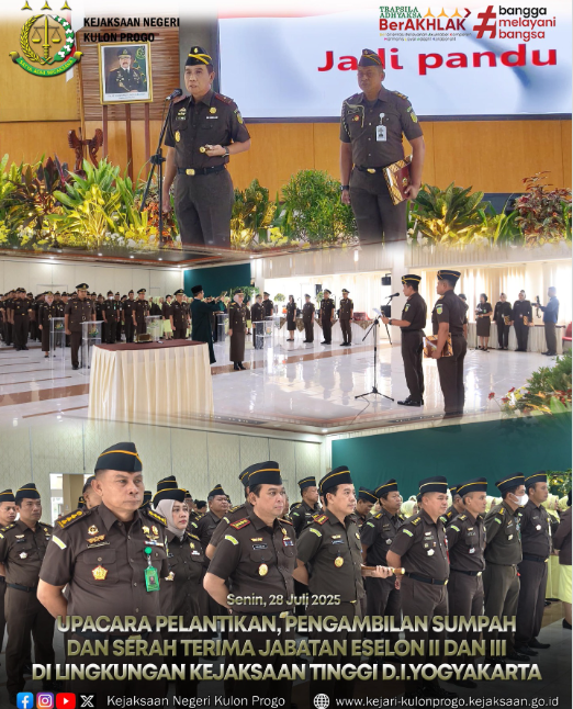 Upacara Pelantikan, Pengambilan Sumpah, dan Serah Terima Jabatan Pejabat Eselon II dan III di lingkungan Kejaksaan Tinggi DIY. yang dipimimpin langsung oleh Kajati DIY, Riono Budisantoso, S.H., M.A., Acara berlangsung khidmat yang juga dihadiri oleh jajaran pejabat utama Kejaksaan, para Kepala Kejaksaan Negeri se- DIY, pejabat eselon IV, serta Pengurus dan Anggota Ikatan Adhyaksa Dharmakarini (IAD) Wilayah dan Daerah. Pelantikan ini mencakup sejumlah posisi strategis, yaitu Wakil Kepala Kejaksaan Tinggi (Wakajati), para Asisten, Kepala Kejaksaan Negeri, serta Koordinator pada Kejati DIY.