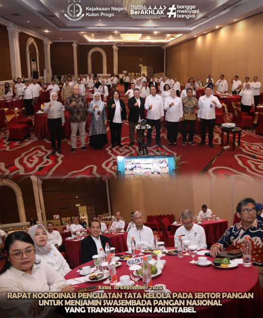 Pada hari Rabu, 10 September 2025 bertempat di Hotel The Rich Yogyakarta Kepala Kejaksaan Negeri Kulon Progo menghadiri rapat Koordiasi Penguatan Tata Kelola Pada Sektor Pangan Untuk Menjamin Swasembada Pangan Nasional, Rapat Koordiasi Penguatan Tata Kelola Pada Sektor Pangan Untuk Menjamin Swasembada Pangan Nasional di buka langsung oleh Jaksa Agung Muda Bidang Perdata dan Tata Usaha Negara (JAMDATUN) Prof. (H.C.) Dr. R. Narendra Jatna, S.H., LL.M