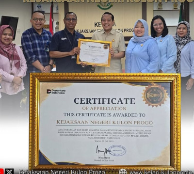 BRI BRANCH OFFICE WATES BERIKAN PENGHARGAAN KEPADA KEJAKSAAN NEGERI KULON PROGO ATAS PEMULIHAN KEUANGAN NEGARA